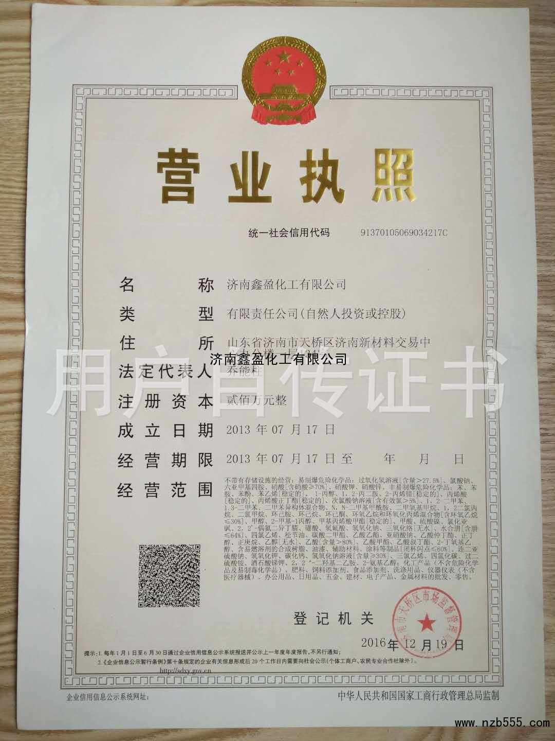 不帶有存儲設施的經營:《危險化學品經營許可證》 魯濟危化經【2019】003354號許可...