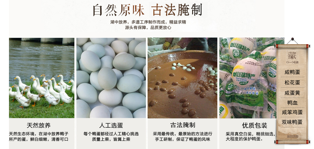 我們是一家生產咸鴨蛋、松花蛋的廠家,有70多年的歷史了。鴨蛋廠位于山東省美麗的微山湖,所產鴨蛋均來自微山湖自然放養,純天然有機食品,采用傳統手工腌制工藝。 1:我們是山東省老字號。 2: 所生產的鴨蛋是經過綠色食品認證的。 3: 所生產的松花蛋和咸鴨蛋具有出口資格,通過了出口食品生產企業備案證明。 4:腌制工藝被選為市級非物質文化遺產。 [