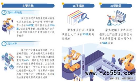 《實施意見》包括三部分內容。第一部分總體要求,充分銜接綠色低碳高質量發展先行區三年行動計劃、先進制造業強省行動計劃等規劃方案,明確支持實體經濟發展的指導思想,提出2023年和2025年的主要目標:到2023年年底,促進實體經濟高質量發展的政策體系更加完善,全年新增“專精特新”中小企業1000家、高新技術企業2000家,制造業增加值、高新技術產業產值、數字經濟核心產業增加值占比穩中有升。到2025年,現代化產業體系加快構建,產業基礎高級化、產業鏈現代化水平明顯提高,“四新”經濟增加值占GDP比重達到40%,創新動力引擎更加強勁,新動能支撐作用凸顯,工業化數字化深度融合,重點行業和企業能效達到全國一流水平,培育形成一批世界級“十強產業”優勢集群,先進制造業強省建設取得突破性成效。