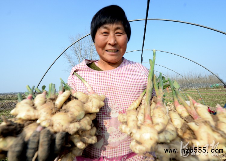 2021年11月4日,河北省磁縣講武城鎮北白道村生姜種植基地內,種植戶在展示剛剛采收的生姜。河北日報記者杜柏樺攝