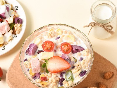 烘焙燕麥、玉米片、紅提干、香蕉片、南瓜籽、椰子片、酸奶塊、巴木旦、蔓越莓、草莓丁