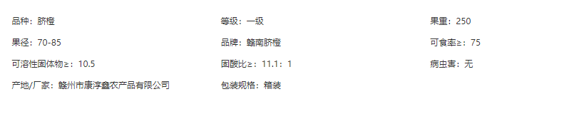 贛南臍橙果大形正,一般每個250克,橙紅鮮艷,光潔美觀,可食率達85%,顏色偏紅,比其他產地的橙子顏色略深;果皮光滑、細膩;果形以橢圓形多見。